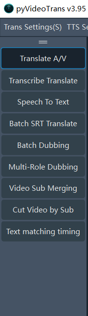 - Left Function Area: Switch between the software's main functional modules, such as Translate Video & Audio, Transcribe & Translate Subtitles, Audio/Video to Subtitles, Batch Translate SRT Subtitles, Batch Dubbing for Subtitles, Multi-role Dubbing for Subtitles, Audio/Video/Subtitle Merge, Clip Video by Subtitles, Script Matching, etc.
